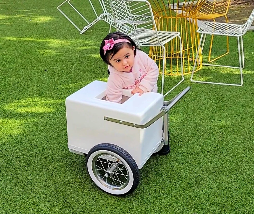 The Standard Size Popsicle Cart with Gold Trim features bicycle tires, two top side openings…