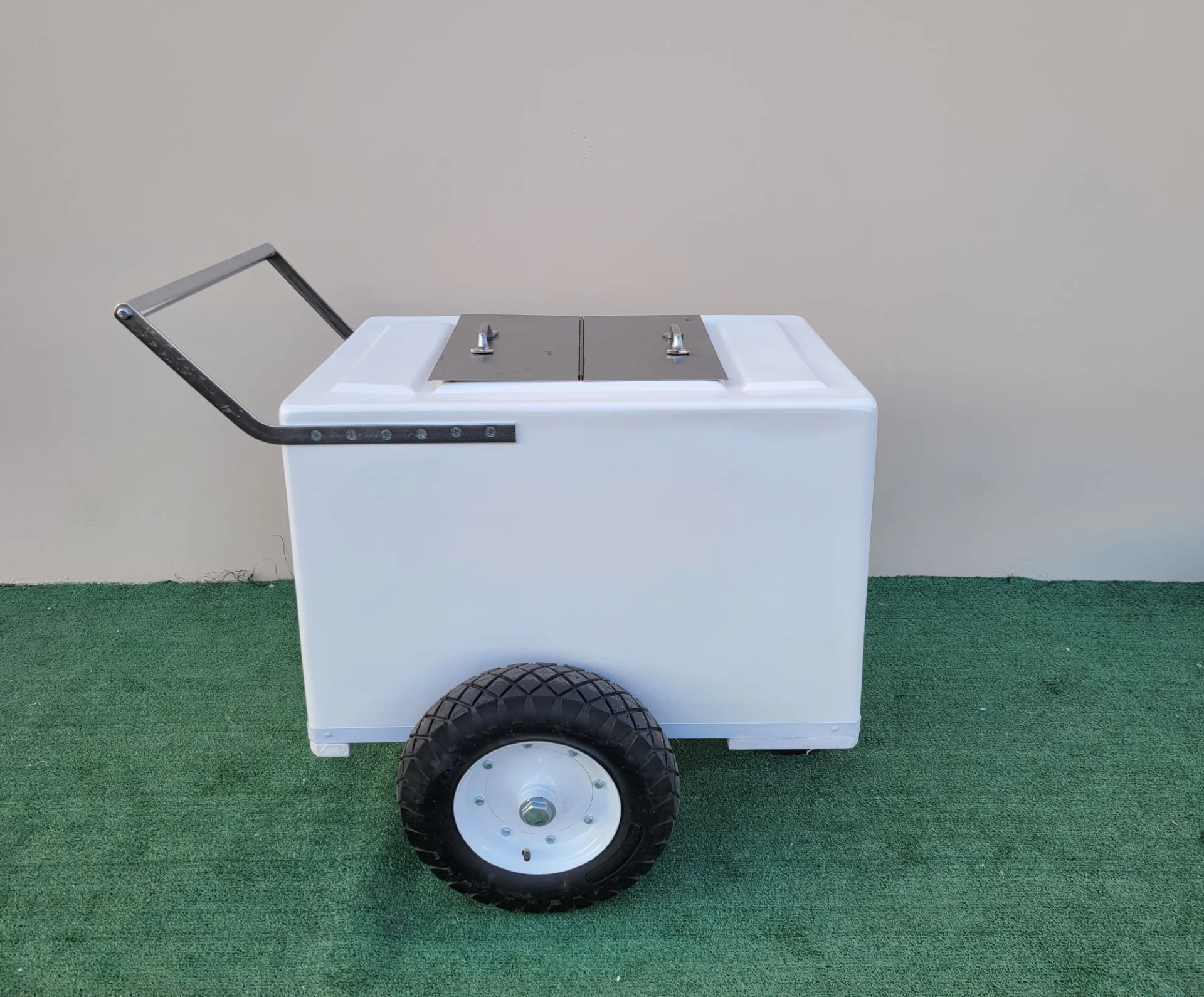 Este Carrito de helados es una herramienta versátil que no requiere electricidad, por lo que es ideal para eventos al aire libre. Su alto aislamiento garantiza que sus delicias congeladas se mantengan frías, y puede almacenar hasta 400 polos o 3 tarrinas de 3 galones. Utilícela con hielo seco o placas frías para mantener los productos frescos durante horas. Gracias a su diseño compacto y ligero, maniobrar con el carrito es muy fácil, incluso en espacios reducidos o con mucho tráfico. Los resistentes neumáticos de este carrito te permiten empujarlo por aceras, playas y otros lugares mientras haces saber a la gente que estás ahí con tu negocio sobre ruedas.