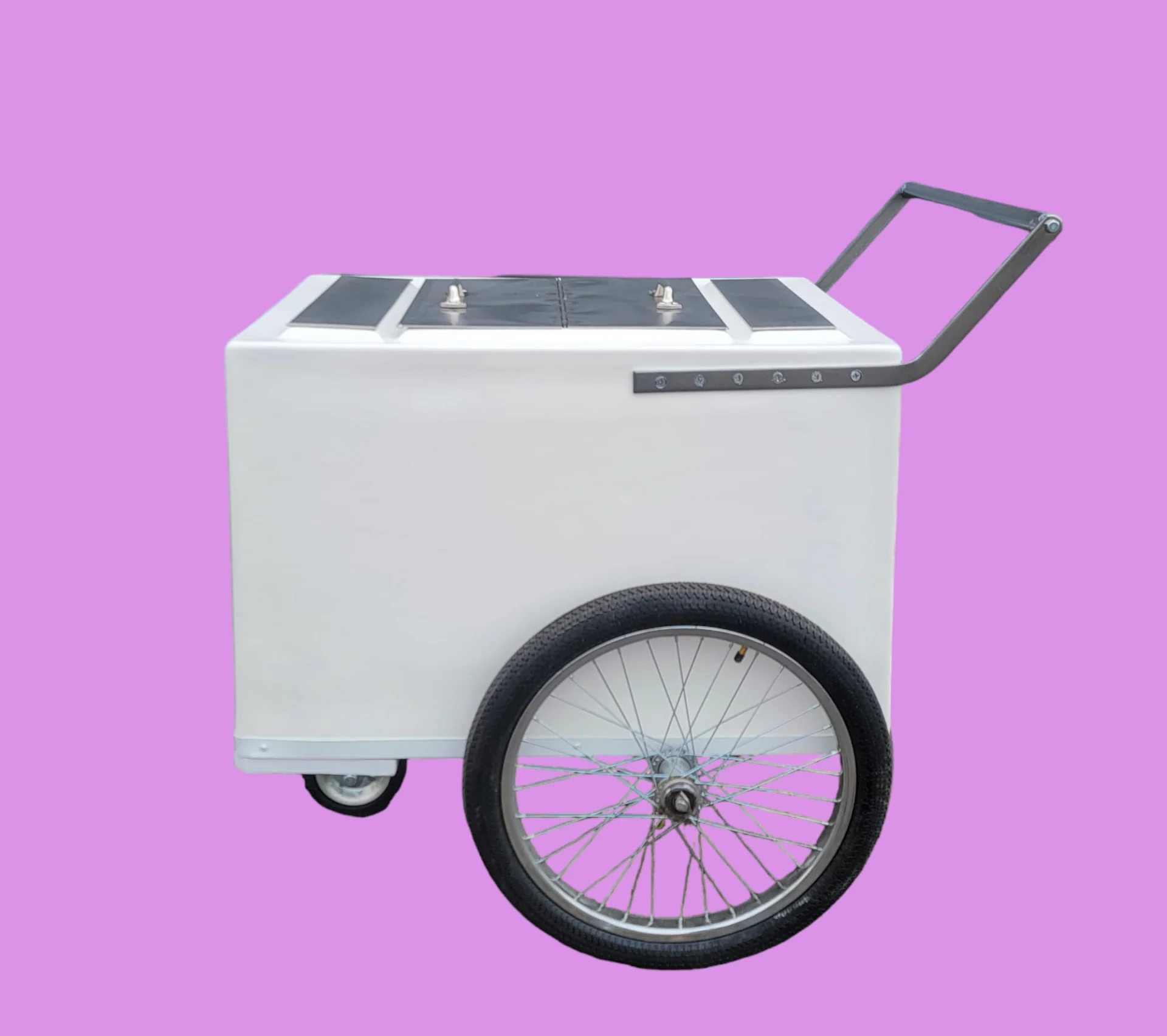 Este Carro de paletas de tamaño estándar es la herramienta perfecta para ampliar su negocio de helados o polos. Con su molduras cromadas y neumáticos de bicicletaEste carro está diseñado para ofrecer durabilidad, estilo y movilidad, por lo que es ideal para catering, eventos pop-up o mercados al aire libre.