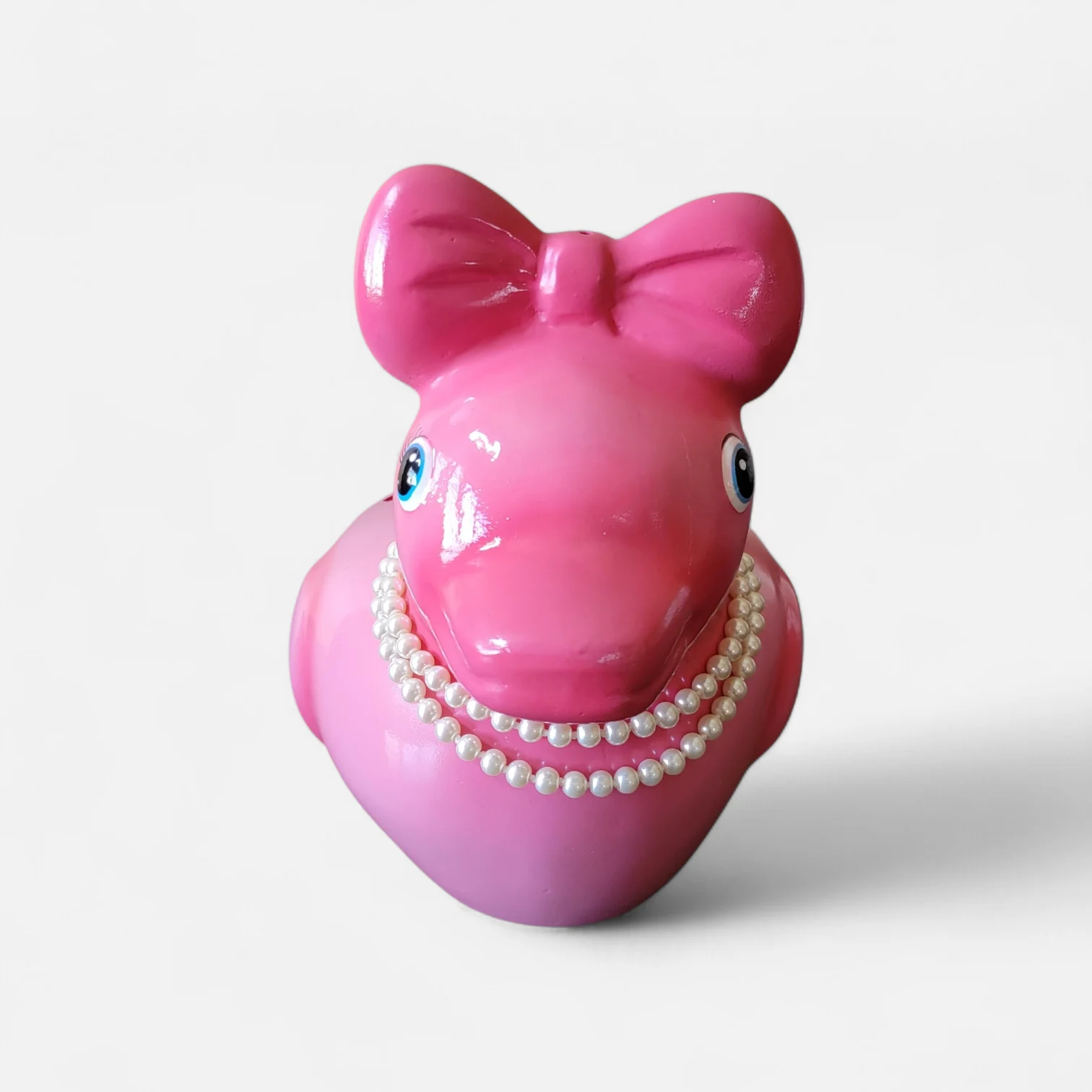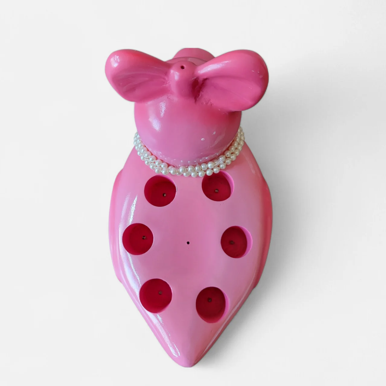A playful pink duck with a pearl necklace that stands out as a one-of-a-kind party serving tray.