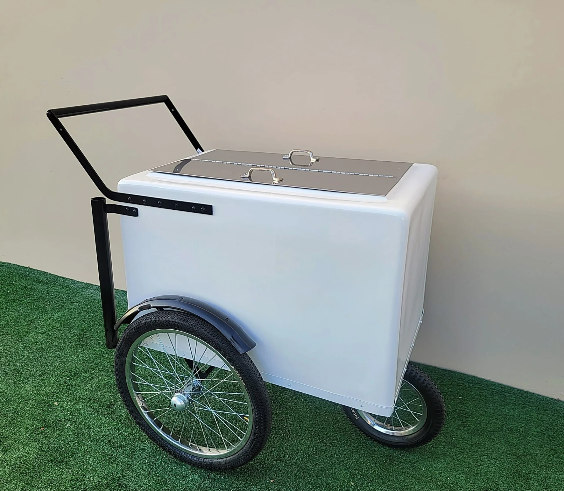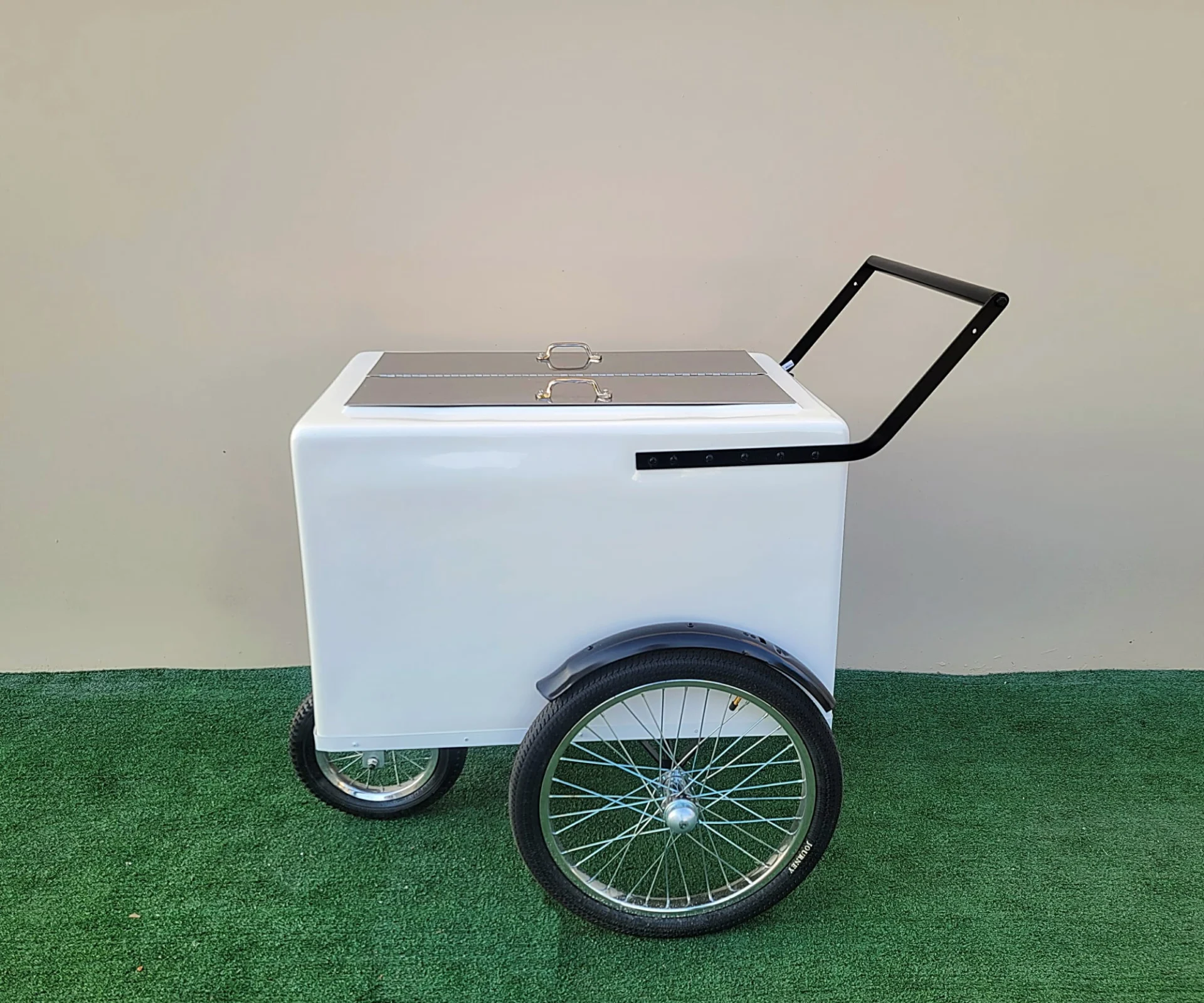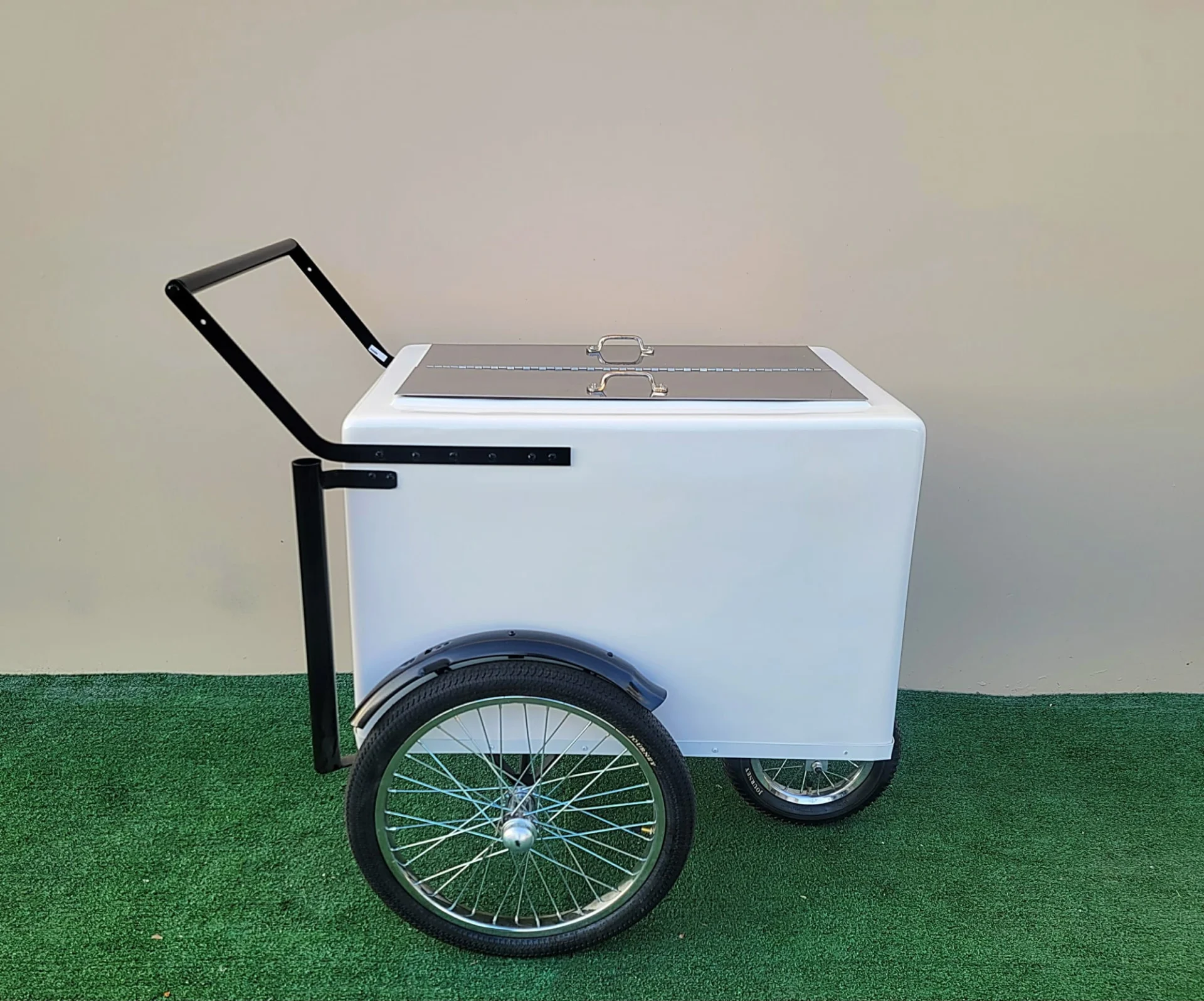 Introducing the Standard Size Popsicle Cart with XL Door featuring sleek black trim and durable bicycle tires. This stylish cart is designed for maximum storage, mobility, and functionality, perfect for entrepreneurs or event planners looking to add a unique touch to their business or gatherings.