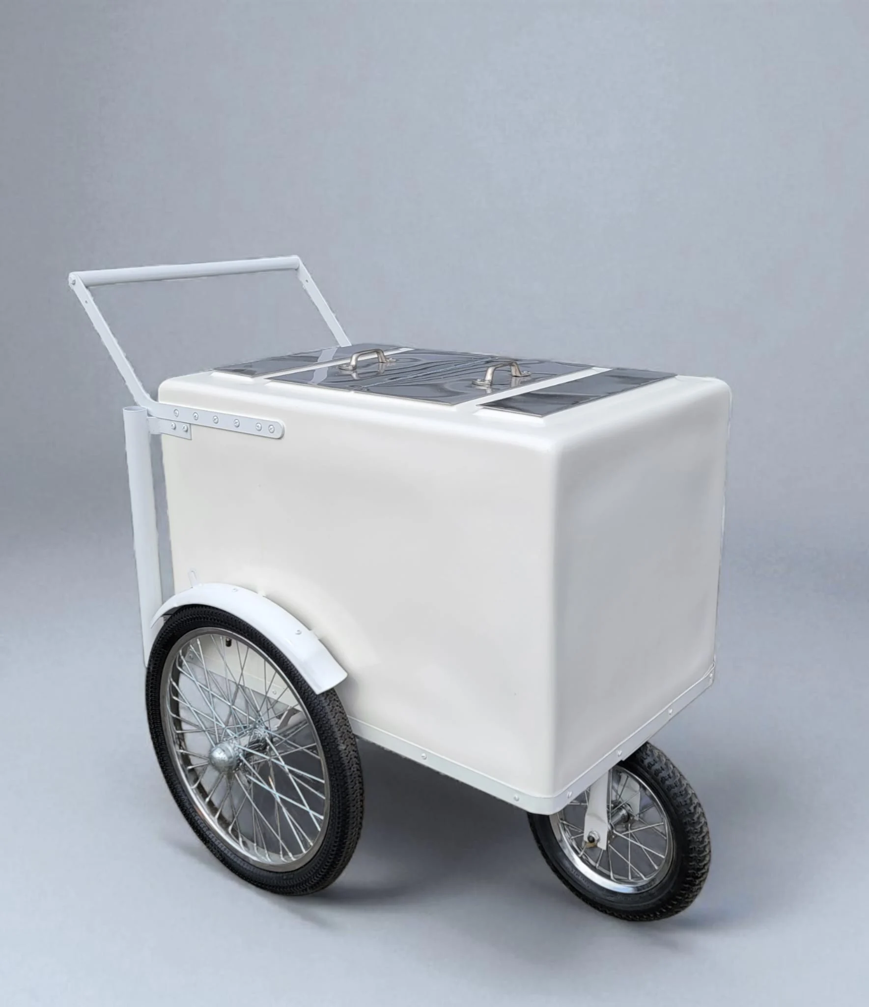The Standard Size Popsicle Cart with fenders, bicycle tires, and an all-white finish is a sleek, functional solution for businesses and events. This cart features three top openings for steel cold plates, offering an efficient and cost-effective way to keep your frozen treats at the perfect temperature without the need for regular or dry ice. The hand-painted white trim over stainless steel adds an elegant touch, making it an attractive focal point for any occasion.